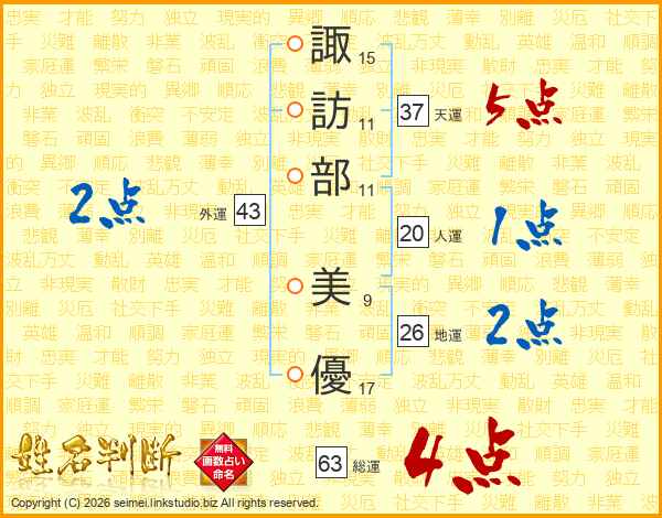 諏(15画)訪(11画)部(11画) 美(9画)優(17画)