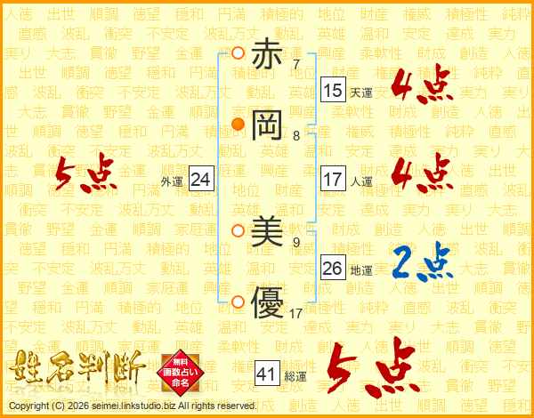 生活面を象徴する運勢です。外部から受ける影響力を表し、結婚運、家庭運や職場、環境への順応性を表します。総運から人運を引いた画数。姓や名が1文字の場合を除く。