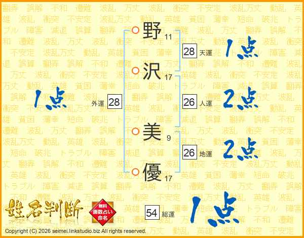 生活面を象徴する運勢です。外部から受ける影響力を表し、結婚運、家庭運や職場、環境への順応性を表します。総運から人運を引いた画数。姓や名が1文字の場合を除く。
