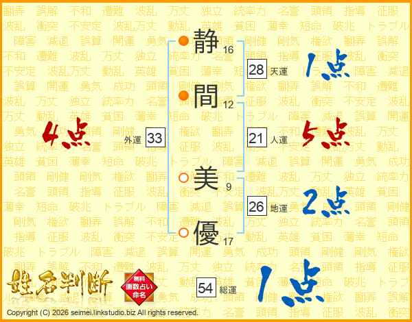 静(16画)間(12画) 美(9画)優(17画)