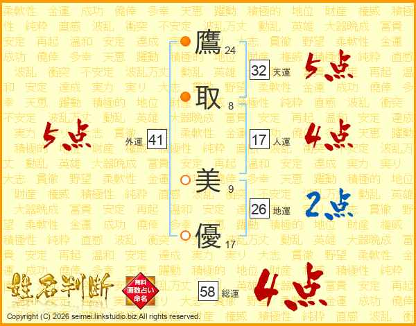鷹(24画)取(8画) 美(9画)優(17画)