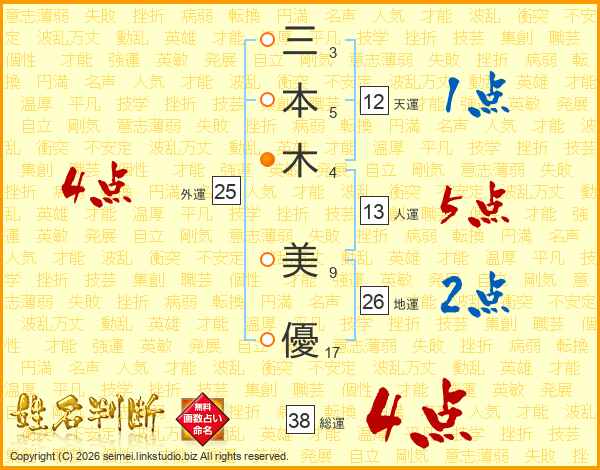 三(3画)本(5画)木(4画) 美(9画)優(17画)