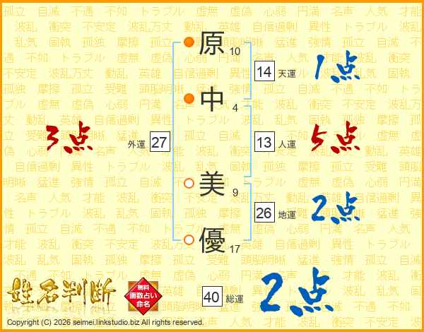 原(10画)中(4画) 美(9画)優(17画)
