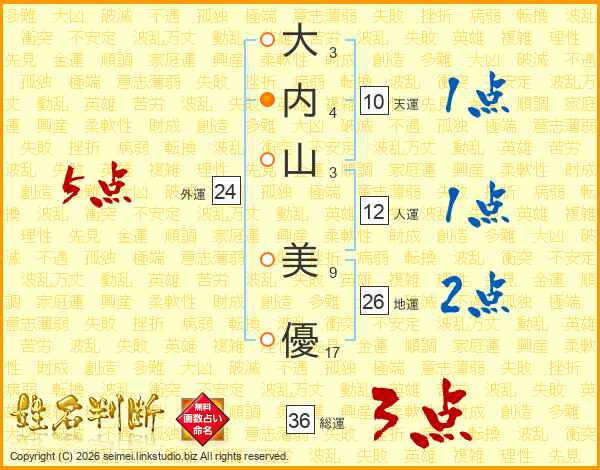 大(3画)内(4画)山(3画) 美(9画)優(17画)