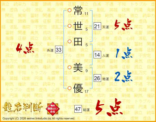 常(11画)世(5画)田(5画) 美(9画)優(17画)