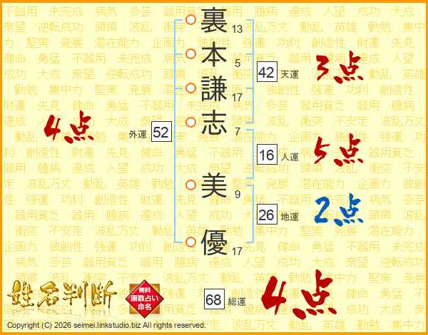 裏(13画)本(5画)謙(17画)志(7画) 美(9画)優(17画)