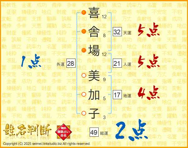 喜(12画)舎(8画)場(12画) 美(9画)加(5画)子(3画)