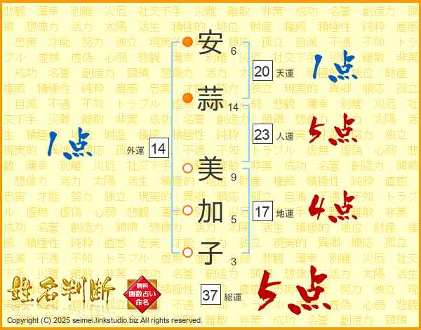 安(6画)蒜(14画) 美(9画)加(5画)子(3画)