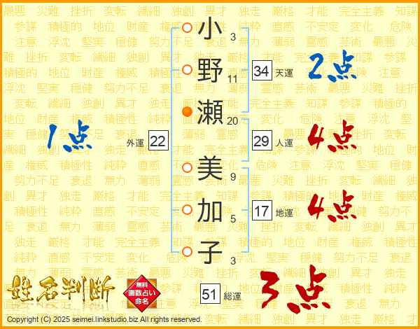 小(3画)野(11画)瀬(20画) 美(9画)加(5画)子(3画)