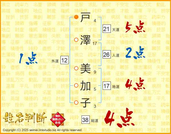 戸(4画)澤(17画) 美(9画)加(5画)子(3画)