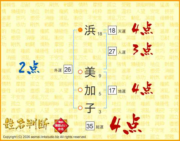 浜(18画) 美(9画)加(5画)子(3画)