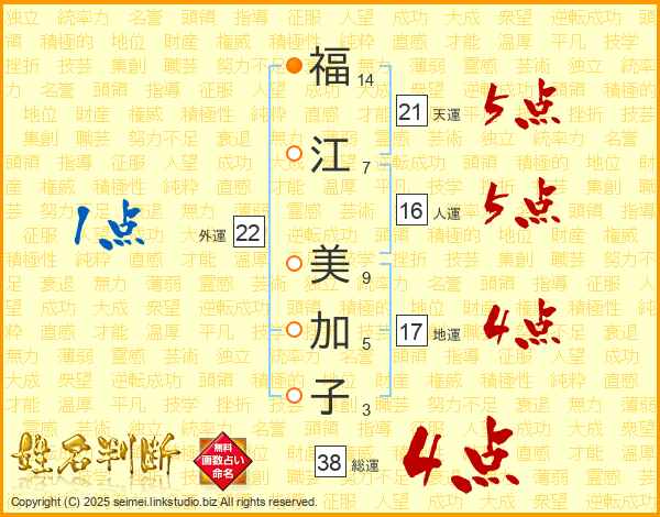 福(14画)江(7画) 美(9画)加(5画)子(3画)