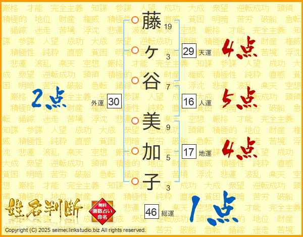 藤(19画)ヶ(3画)谷(7画) 美(9画)加(5画)子(3画)