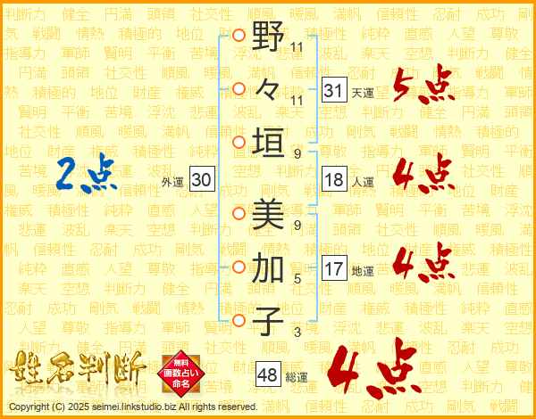 野(11画)々(11画)垣(9画) 美(9画)加(5画)子(3画)