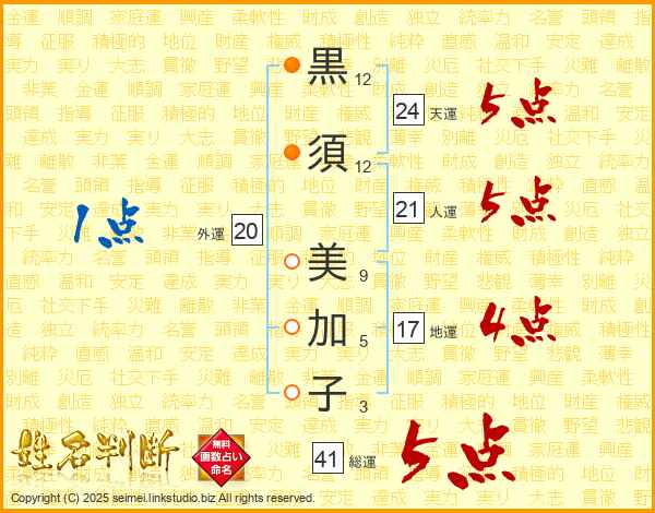 黒(12画)須(12画) 美(9画)加(5画)子(3画)