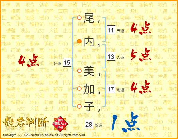 尾(7画)内(4画) 美(9画)加(5画)子(3画)
