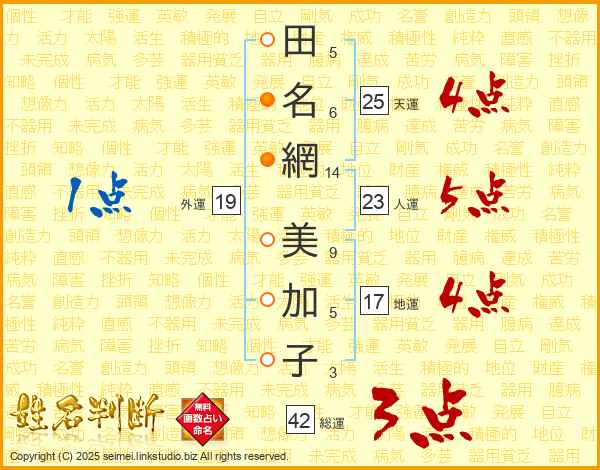 田(5画)名(6画)網(14画) 美(9画)加(5画)子(3画)