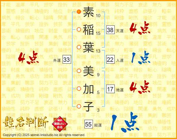 素(10画)稲(15画)葉(13画) 美(9画)加(5画)子(3画)