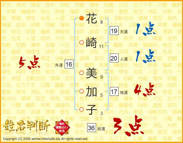 花(8画)崎(11画) 美(9画)加(5画)子(3画)