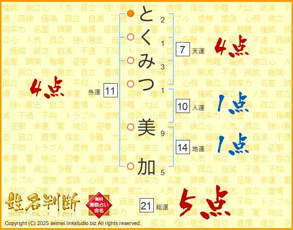 とくみつ美加さんの総運は21画の5点!
