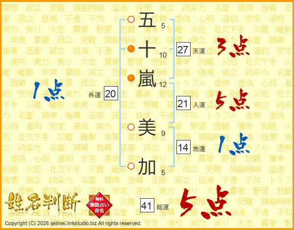 五(5画)十(10画)嵐(12画) 美(9画)加(5画)