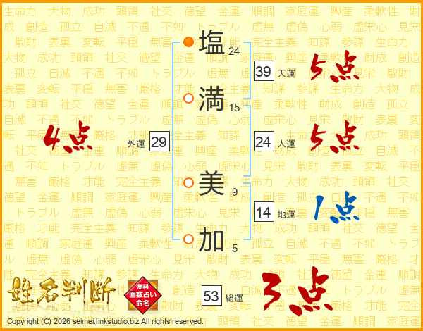 塩(24画)満(15画) 美(9画)加(5画)
