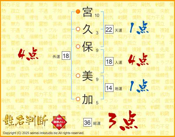 宮(10画)久(3画)保(9画) 美(9画)加(5画)