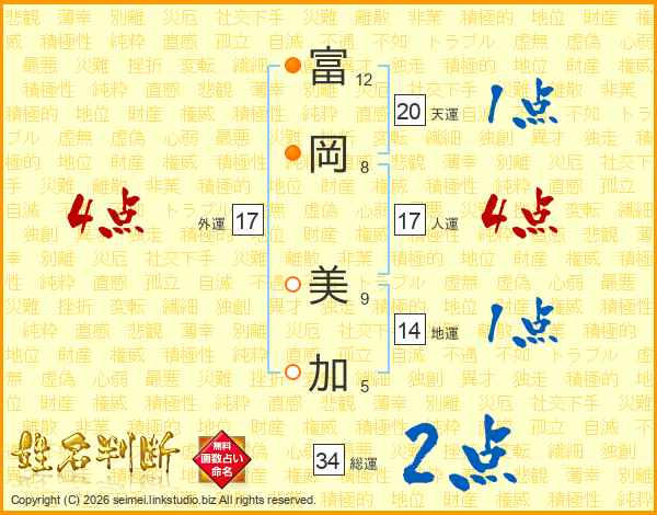 富(12画)岡(8画) 美(9画)加(5画)