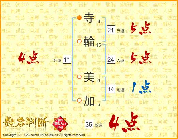 寺(6画)輪(15画) 美(9画)加(5画)