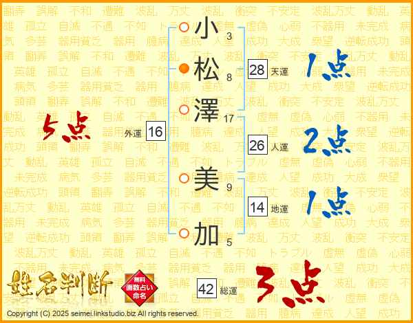 小(3画)松(8画)澤(17画) 美(9画)加(5画)