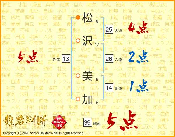 松(8画)沢(17画) 美(9画)加(5画)