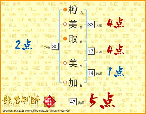 樽(16画)美(9画)取(8画) 美(9画)加(5画)