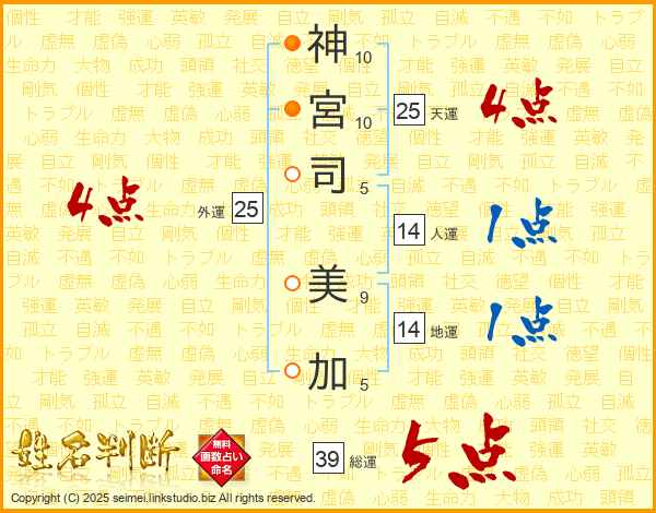 神(10画)宮(10画)司(5画) 美(9画)加(5画)
