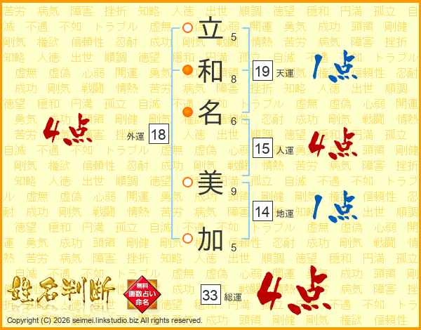 立(5画)和(8画)名(6画) 美(9画)加(5画)
