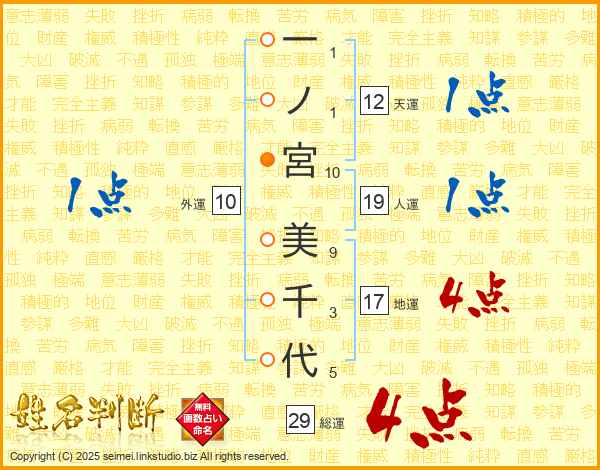 一(1画)ノ(1画)宮(10画) 美(9画)千(3画)代(5画)
