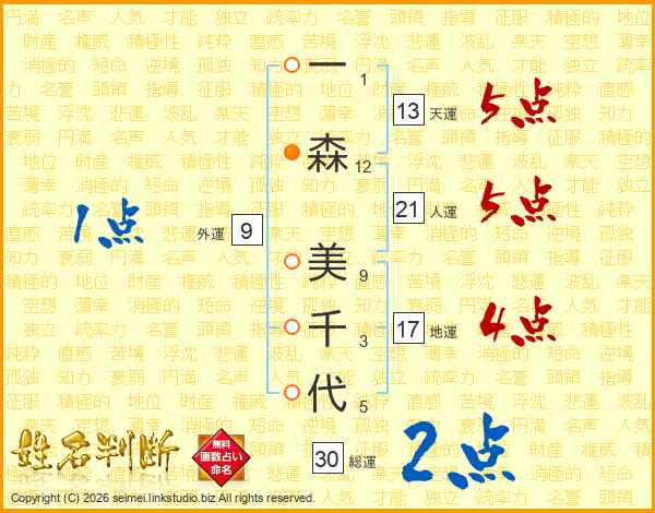 一(1画)森(12画) 美(9画)千(3画)代(5画)