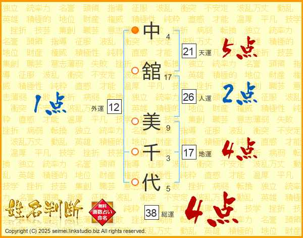 中(4画)舘(17画) 美(9画)千(3画)代(5画)