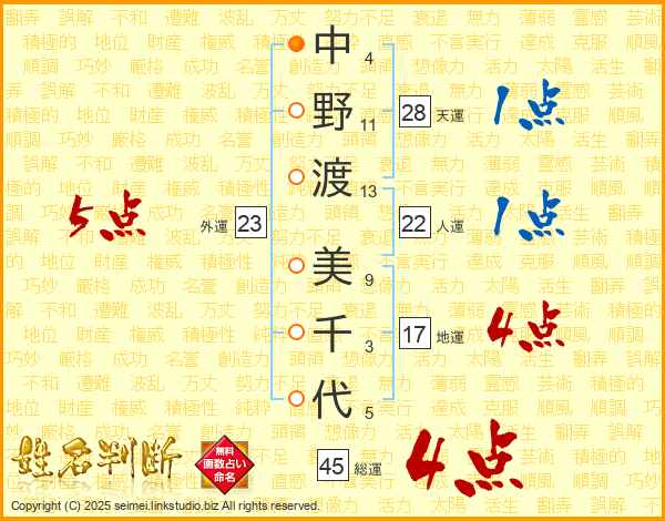 中(4画)野(11画)渡(13画) 美(9画)千(3画)代(5画)