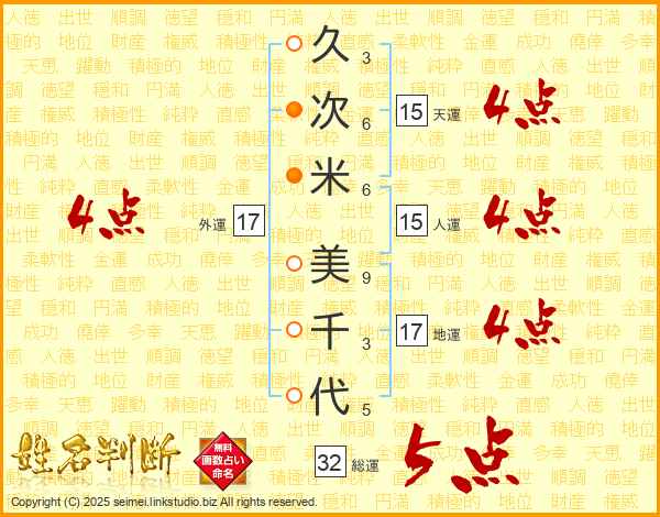 久(3画)次(6画)米(6画) 美(9画)千(3画)代(5画)