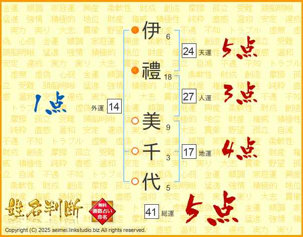 伊(6画)禮(18画) 美(9画)千(3画)代(5画)