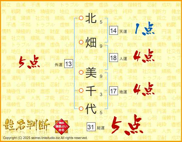 北(5画)畑(9画) 美(9画)千(3画)代(5画)
