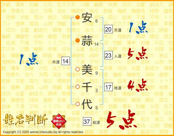 安(6画)蒜(14画) 美(9画)千(3画)代(5画)