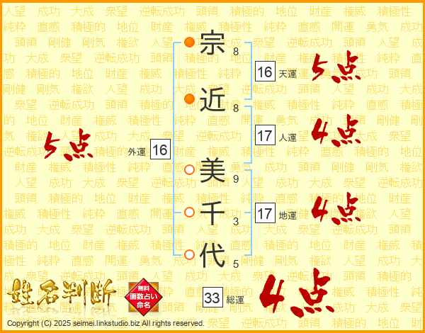 宗(8画)近(8画) 美(9画)千(3画)代(5画)