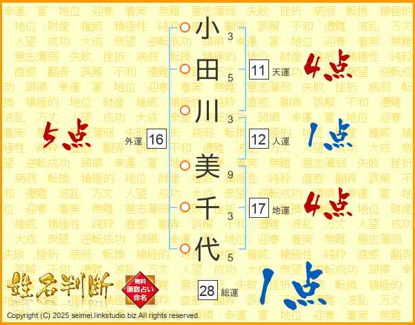 小(3画)田(5画)川(3画) 美(9画)千(3画)代(5画)