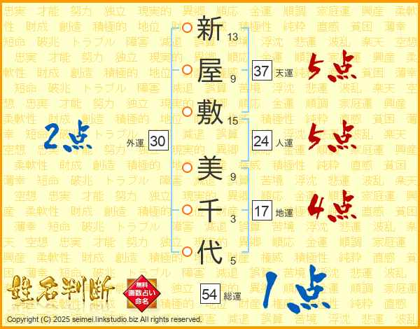 新(13画)屋(9画)敷(15画) 美(9画)千(3画)代(5画)