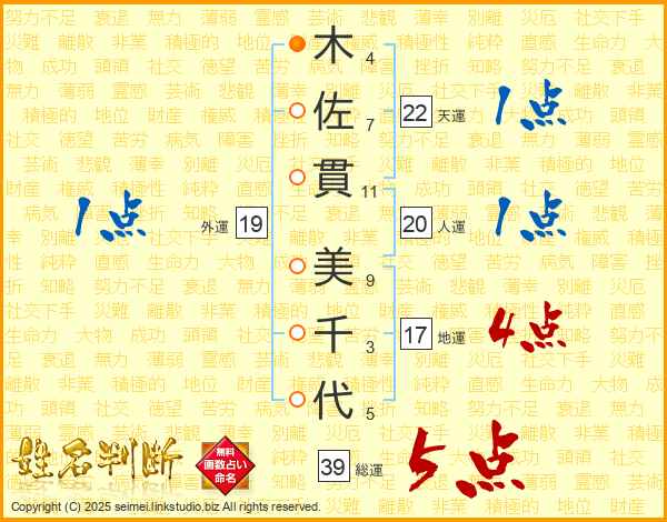 木(4画)佐(7画)貫(11画) 美(9画)千(3画)代(5画)