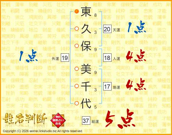 東(8画)久(3画)保(9画) 美(9画)千(3画)代(5画)