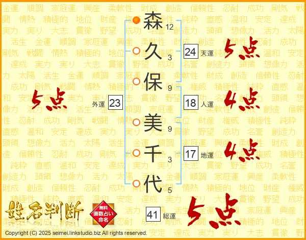 森(12画)久(3画)保(9画) 美(9画)千(3画)代(5画)