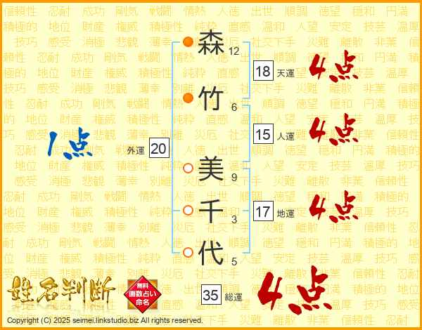 森(12画)竹(6画) 美(9画)千(3画)代(5画)