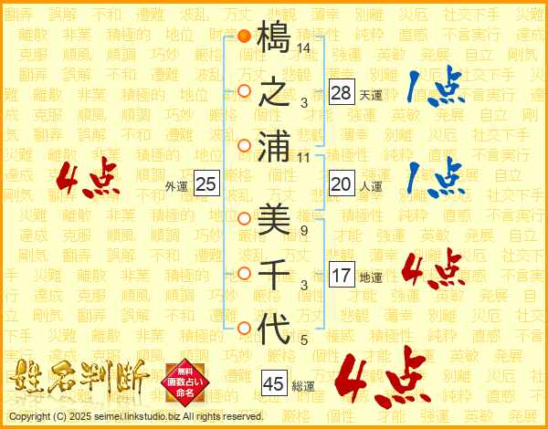 槝(14画)之(3画)浦(11画) 美(9画)千(3画)代(5画)